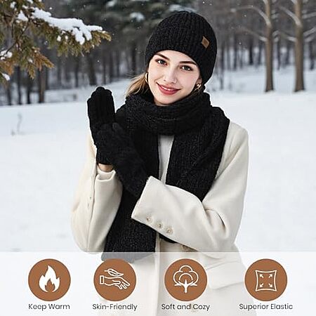 $8.99* | Clothirily Women's 3-in-1 Winter Beanie Hat, Scarf & Gloves Set (Black) at Amazon