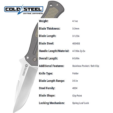 COLD STEEL Crawford Model 1 3.5" 4034SS Clip Point Blade Folding Knife (20MWC) on sale for
