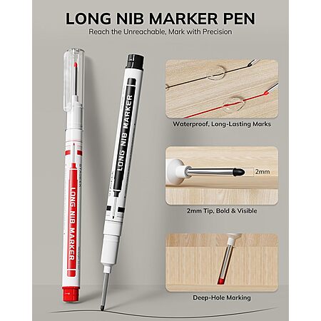 - Deep Hole Marker Pens: Waterproof long nib markers, ideal for marking on surfaces where woodworking pencils can't, such as glass, metal, and plastic. These long head deep hole markers expand the versatility of the set, ensuring precise markings on various materials.
