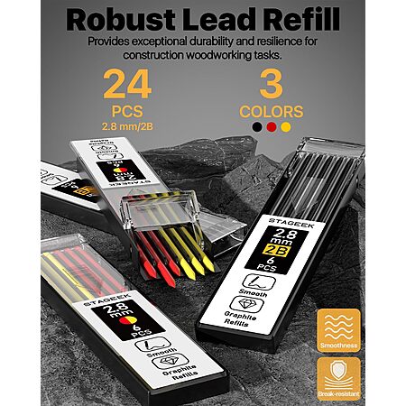- Abundant & Robust Lead Refills: With a 2.8 mm thick lead in black, red, and yellow , our carpenter pencil delivers superior strength and resilience for construction woodworking tasks, reducing breakage and damage. Designed for extended use.