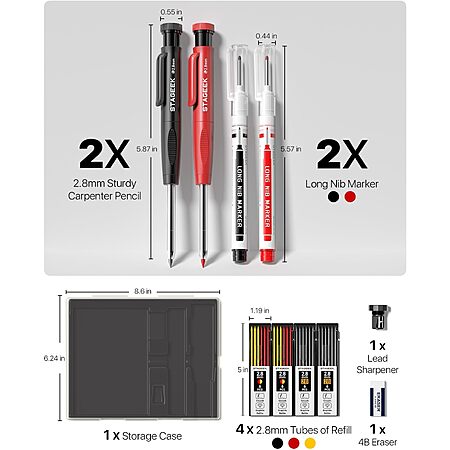 About this item- Exquisite Carpenter Pencil Set: Includes 2pcs sturdy carpenter pencils, 26pcs 2.8mm 2B lead refills in black, red, and yellow. You'll also receive 2pcs Long Nosed Marker Pens in red and black ink, a plastic storage box for easy organization. Additionally, the set comes with a replaceable sharpener and a 4B eraser. With this comprehensive collection of tools, completing tasks becomes both swift and effortless.