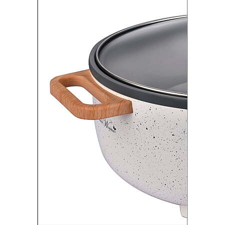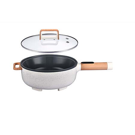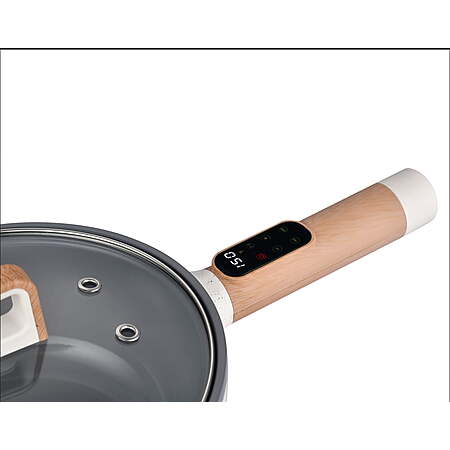 Per product page: With a 3.5-liter capacity and 1400 watts of power, it's perfect for cooking large meals. The ceramic non-stick surface ensures even cooking and easy cleanup. Its adjustable digital temperature control lets you set the perfect heat for anything from simmering to searing. The tempered glass lid lets you check on your food without losing heat, and the steam vent helps prevent condensation.