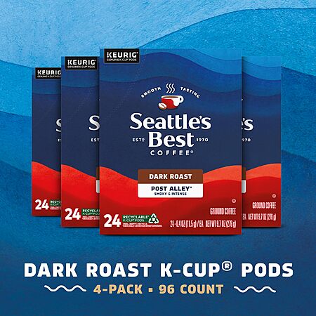 Seattle’s Best Coffee, Dark Roast K-Cup Coffee Pods, Post Alley, 100% Arabica, 4 Boxes (96 Pods Total) $38.50 or less S&S Clip Q YMMV