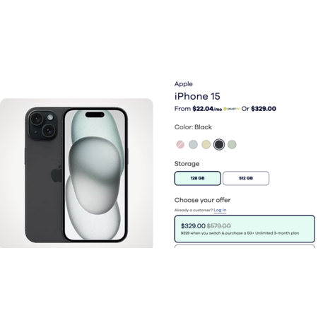 Total Wireless iPhone 15 128GB Black ($329.00) with 3-month of 5G+ Unlimited plan ($195) and mandatory Port-in, ID verification, Selfie Upload $524