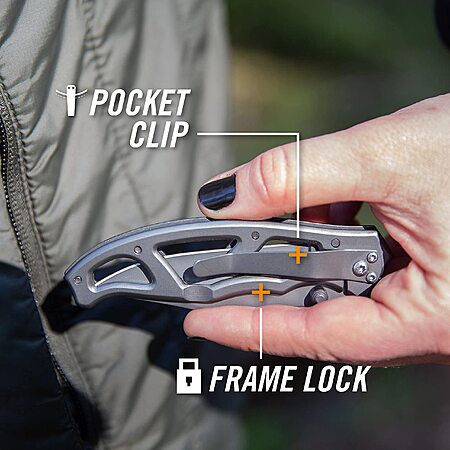 SLIM DESIGN FOR EASY CARRY: The lightweight open stainless steel handles and frame lock design make for safe carrying and easy cleaning of this tactical folding knife.