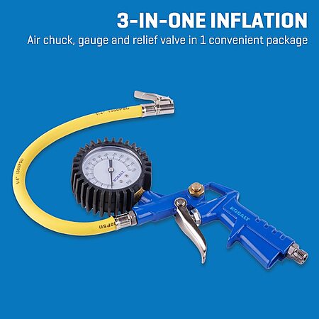 Product Details:- Air chuck, gauge and relief valve in one convenient package; quick inflation, deflation and pressure measurement, with attachments included for tires, sports balls, air mattresses and more