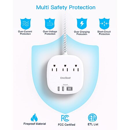 One Beat via Amazon has 6' One Beat Flat Plug Power Strip (3x AC, 2x USB-A, 2x USB-C, Right Angle Plug, White) on sale for $9.99. Shipping is free with Prime or on $35+ orders.