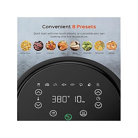 - Powerful 9 Functions: One touch preheat and 8 presets help you unfreeze, bake, cook, crisp, dehydrate and quickly reheat your foods. Use the default settings or change the time and temperature to customize your own cooking process.