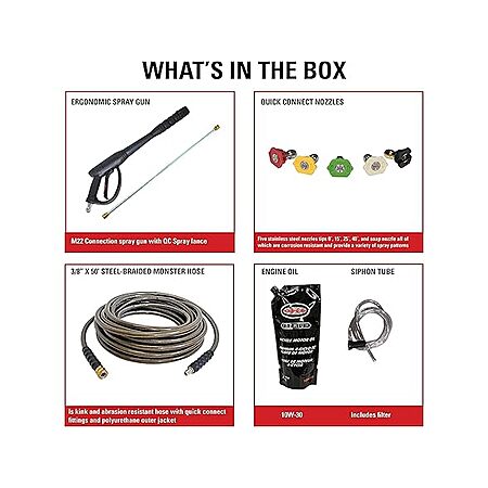 - PRO PRESSURE WASHER ACCESSORIES: Five quick-connect pressure washer tips (0°, 15°, 25°, 40°, and soap nozzle) cover tasks from stripping paint to car cleaning; Rear-load M22 pressure washer gun and 31" spray wand included