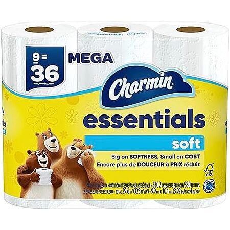 $7.99 | 9-Pack 330-Sheets Charmin Toilet Paper Mega Rolls (Essentials Soft) at Amazon