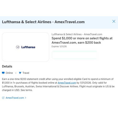 Earn a one-time $200 statement credit after using your enrolled eligible Card to spend a minimum of $1,000 in 1+ purchases of flights booked online at AmexTravel.com by 1/31/2026. Only valid for Lufthansa, Brussels, Austrian, Swiss International & Discover Airlines. Flight must originate in US & be charged in USD. See terms.