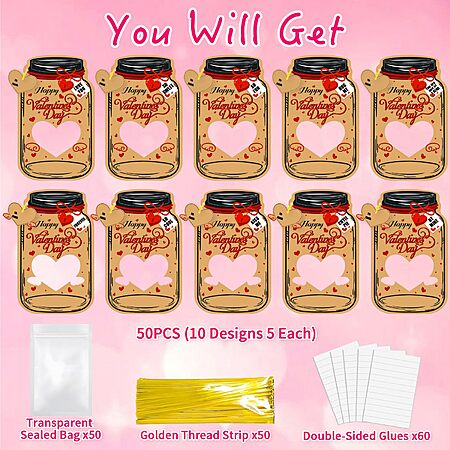 - VALENTINE'S DAY MASON JAR CARD SET: You'll get 50 valentines day mason jar cards in 2 delightful designs, 50 heart shaped Cards, 50 clear sealable pouches, 50 double-sided adhesive tape, and 50 gold rolling tape. With our valentines day cards set, it's the perfect blend of valentine's day celebration charm and customization