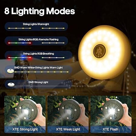 Model: DGE Camping String Lights, 8 Lighting Modes 2-in-1 Outdoor String Lights with RGB and Warm White Light (32.8ft), Quick Storage, Waterproof, Type-C Charging for Camping, Holiday