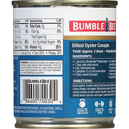Bumble Bee Premium Select Whole Canned Oysters, 8 oz Can - Ready to Eat - 14g Protein per Serving - Gluten Free~$2.72 With S&S @ Amazon
