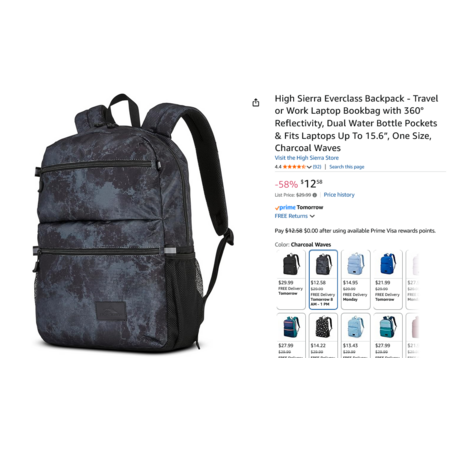 YMMV - High Sierra Everclass Backpack w/360° Reflectivity, Dual Water Bottle Pockets, Fits 15.6" Laptops, Charcoal Waves $12.58 @ Amazon