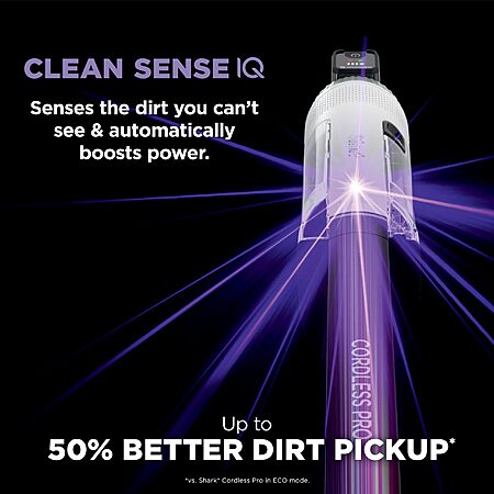 CLEAN SENSE IQ: An infrared sensor detects the dirt you can't see and automatically increases power, giving you up to 50% better dirt pickup*, visually indicating when floors are clean. *vs. Shark Cordless Pro in ECO mode.