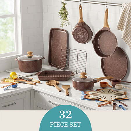 The Pioneer Woman 32-Piece Nonstick Cast Aluminum Cookware and Kitchen Utensil Set, Brown $97