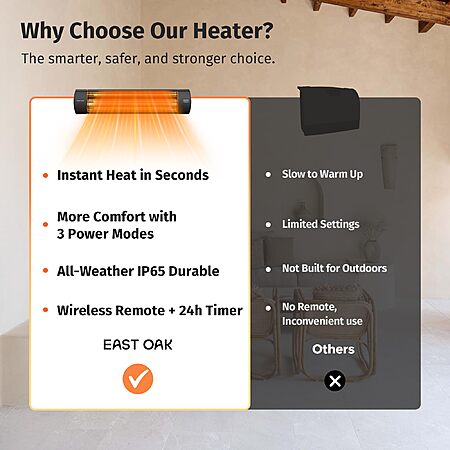 Model: EAST OAK Electric Patio Heater | 1500W Wall Mounted Infrared Heater for Outdoor, Garage, Backyard, Restaurant | 24H Timer, IP65 Waterproof | 3 Heat Levels & Overheating Protection | Black