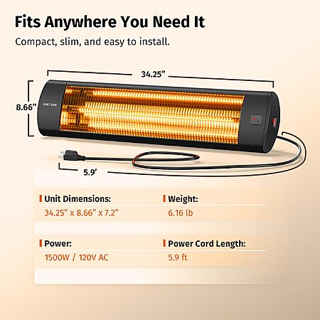 Amazon[amazon.com] has the EAST OAK 1500W IP65 Outdoor Infrared Heater (Wall Mount, 3 Heat Modes, Overheat Protection) for $98.99. Shipping is free.