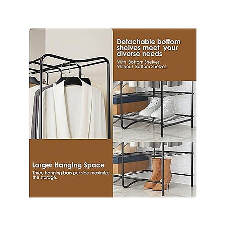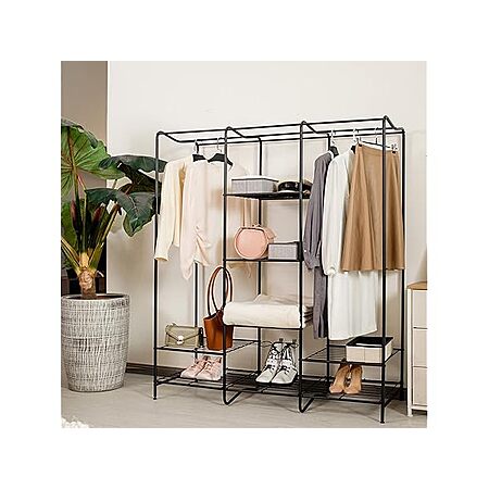 - Multiple Hanging Rods: Designed with side hanging areas for long garments and 3 top hanging rods. Use the center rod for heavier clothing and the side rods for lighter items or accessories to maintain balance.