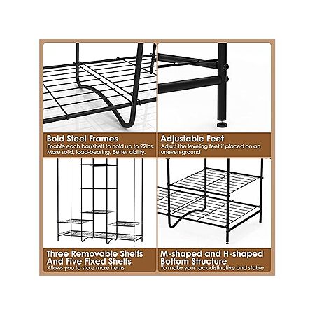 - Sturdy & Stable Construction: Made of thick steel with powder coating for water and rust resistance; supports up to 22 lbs per shelf and 22 lbs per hanging rod. Includes a reinforced base and 4 adjustable leveling feet for stability on uneven floors and floor protection.