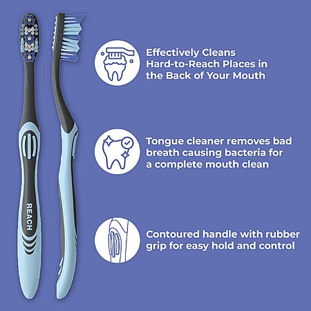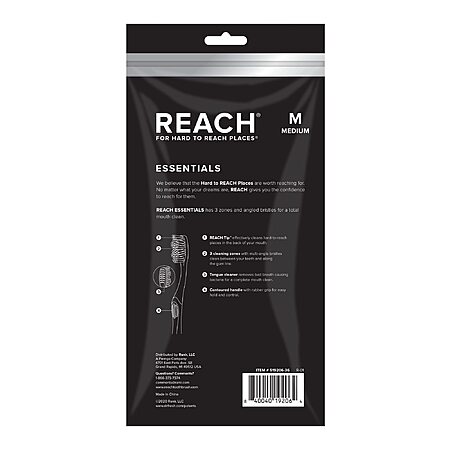 Model: REACH Essentials Toothbrush with Toothbrush Covers, Multi-Angled Medium Bristles, Contoured Handle, Tongue Scraper, 6 Count