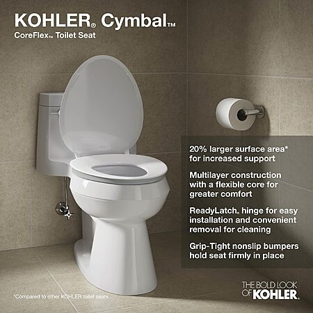 - CoreFlex flexible material under entire seating surface allows seat to adapt and conform to each user's sitting position; KOHLER Cymbal toilet seat has a 20% wider sitting surface than standard KOHLER toilet seats