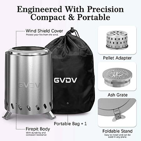 - The GVDV fire pit features foldable legs and includes a portable bag, allowing you to effortlessly take it wherever you go. Whether at home or on the road, you can enjoy a cozy fire pit experience with minimal setup.