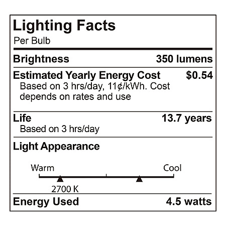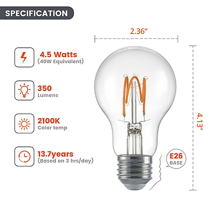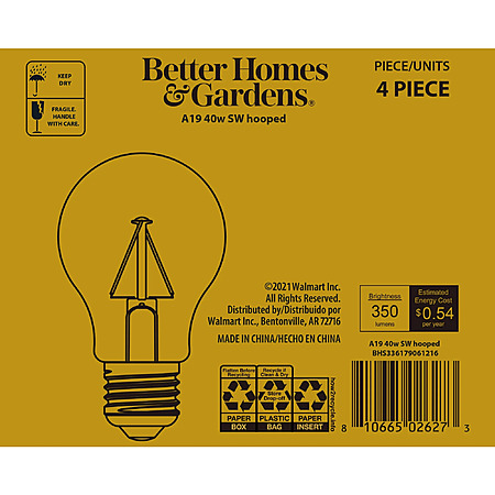 Model: Better Homes & Gardens LED Light Bulb, 4.5 Watts (40W Equivalent) A19 Vintage Style Bulb, E26 Medium Base, Dimmable, Amber White, 4-Pack