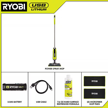 RYOBI USB Lithium Cordless Agitating Spray Mop Kit with 2.0 Ah Battery, Charging Cable, (2) Microfiber Cloth Pads, and Formula. Free Shipping.
