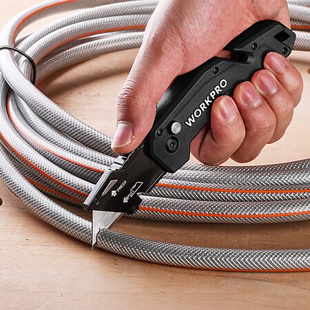 This Workpro folding utility knife is $9.99 on Amazon, other stores have it for around $14 or more. It has a nylon handle, quick-change blades, with 10 extras included, plus a wire stripper and gut hook. The red and pink versions are also $9.99.
