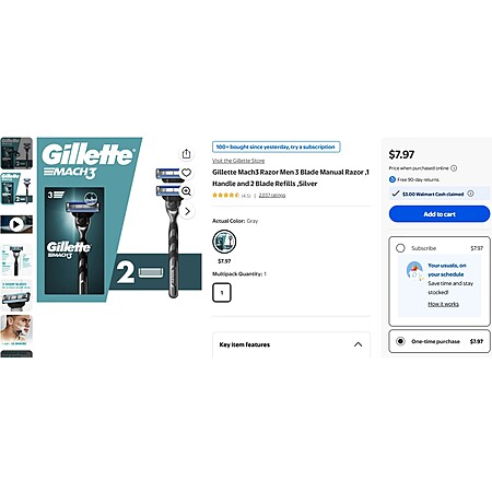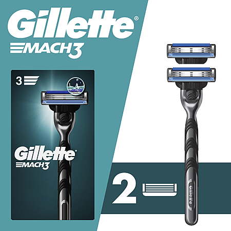 $3 WM Cash + Gillette Mach3 Razor Men 3 Blade Manual Razor ,1 Handle and 2 Blade Refills ,Silver $7.97