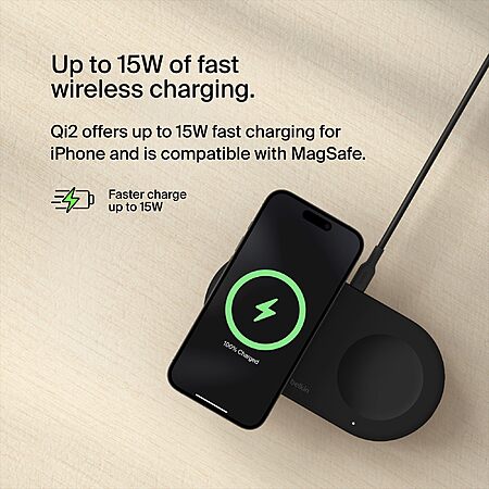 Model: Belkin 2-in-1 Wireless Charging Pad w/ Qi2 15W + Additional USB-C Port - MagSafe-Compatible iPhone Charger, Charging Station for iPhone 16, iPhone 15, & iPhone 14 Series, AirPods, and More - Black