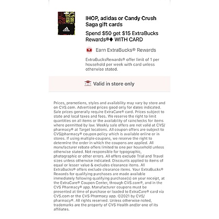 CVS in-store: Buy $50 GC, Get $15 Extra Care Bucks: iHop, adidas, Candy Crush