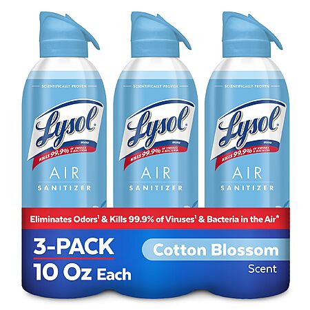 S&S Lysol Air Sanitizer Spray with Odor Eliminator for Home & Office, Sanitizing Spray, Air Freshener Alternative, Cotton Blossom Scent, 10 oz (Pack of 3) for $13.83