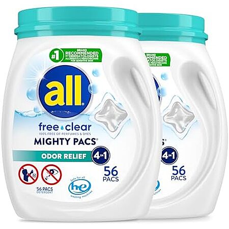 Amazon[amazon.com] has 2-Pack 56-Count all Mighty Pacs Laundry Detergent for $20.36 - 5% when you check out via Subscribe & Save = $19.34. Shipping is free with Prime or on $35+ orders.