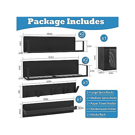 - 7-Pack Kitchen Organizer: Includes 2 large spice racks, 2 medium spice racks, 1 paper towel holder, 1 kitchenware holder, and 1 5-Hook rack organizer. Various shelves help keep your home orderly. Easy to clean with a damp cloth or rinse with water.