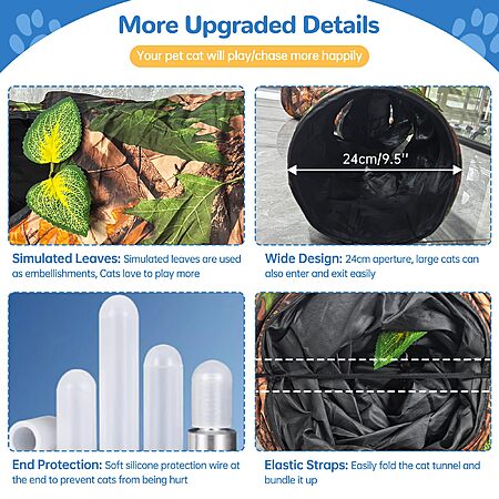 - 🐈【Rustle Joy】This new cat tunnel is made of a special fiber and coating that produces a rustling sound when cats pass through it, ensuring that it is both attractive to cats and safe and durable. This rustling design not only increases the fun of cats playing, but also provides an auditory stimulation that makes cats feel more excited and satisfied when exploring the tunnel. This design is especially beneficial for cats who live alone or indoors, as it helps them burn off excess energy and reduce potential anxiety and stress.
