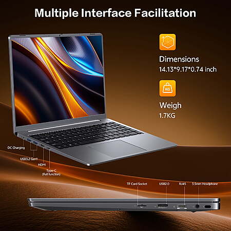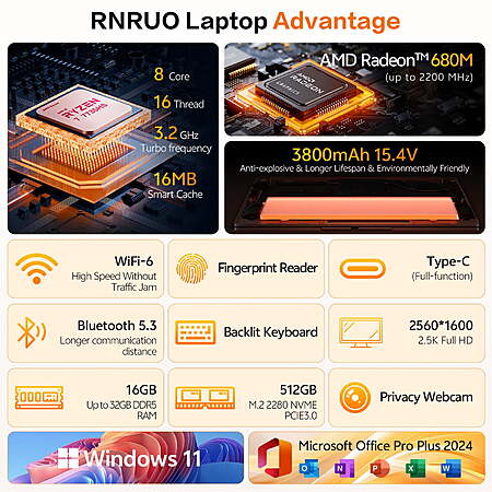 | Product Description: | RNRUO Gaming Laptop, featuring an AMD Ryzen R7-7735H processor (up to 4.75GHz Turbo Boost), 16GB LPDDR5 RAM, and a 512GB SSD(Exp. to 32GB+2TB) for lightning-fast responsiveness and reliable multitasking. Pre-installed with Windows 11, this netbook computer blends high efficiency with low power consumption, ensuring seamless productivity for business, study, or casual gaming. Designed for professionals and students alike, the RNRUO ultrabook delivers the perfect balance of speed, stability, and portability which is your ideal partner for work and beyond. Features of Student Laptop 1) AMD Ryzen R7-7735H, Up to 4.75GHz CPU, 8 cores, 16 threads, 45MB Cache 2) Windows 11 or Linux operating system 3) 15.9" 2560x1600 IPS LCD Screen 4) 16GB LPDDR5 RAM 512GB SSD, Enjoy laptop speed and performance 5) Bluetooth 5.3, Dual-Band WiFi 2.4G/6G 6) Lightweight design and advanced connectivity 7) Backlit Laser Engraved Keyboard (Fn+Space bar) 8) Interface: DC*1, USB 3.2*GEN1*2, HDMI1.4*1, TYPE C Full-function*1, ∮3.5mm*1, RJ45*1, USB2.0*1, TF*1, Kensington Lock Slot*1 9) Warranty & Support: A full 12-month warranty. Our dedicated team is always on standby to help. AMD R7 7735H Processor: Powered by AMD Ryzen R7-7735H processor processor (8 cores, 16 threads, up to 4.75GHz), the RNRUO ultrabook easily handles professional video editing and gaming. Multitasking is a breeze, helping you focus on efficient creation and immersive entertainment. Powerful Configuration: Boasting dual channel 16GB DDR5 RAM and a 512GB high-speed SSD, it ensures smooth system operation. With the hard drive expandable up to 2TB and support for a 128GB micro SD card, it provides ample storage space for your personal files. Vibrant Full HD Display: Experience stunning visuals on the 15.9 inch FHD IPS display with a 2560x1600 resolution. The 0.2-inch micro bezel and an impressive 90% screen-to-body ratio guarantee an immersive and visually captivating viewing experience. Backlit KB & Fingerprint: The backlit keyboard is made for comfort and speed. Press the Fn key + Space bar to turn on the PC computer backlit keyboard. It helps you type easily in the dark. Great for late night work or when it's dim. The fingerprint unlock opens your device fast and keeps it safe. Rich Expansion Interface: Comes with USB2.0, USB 3.2 ports, HDMI 1.4 port, full-function Type-C port, 3.5mm headphone jack, TF card slot, and Type-C DC jack. With Wi-Fi 6 and BT5.3, it delivers smooth web browsing and stable connections to latest smart devices. Extended Battery: The 45W TDP (Max 64W) and 58.52Wh long battery life design enables 6 hours of office use, ensuring you stay productive through long workdays and get back to full power in no time when you need a quick boost. |