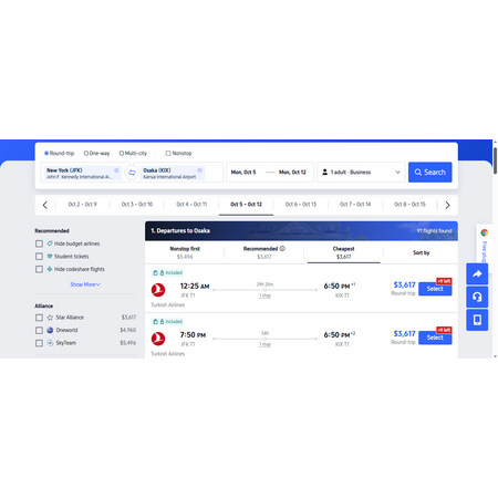 Turkish Airlines via Trip.com have round trip, business class airfares travelling from New York (JFK) to Osaka Japan (KIX) for $3617, making 1 stop in Istanbul both ways. Stopovers range from 2-21 hours depending on the flight you choose. In one screenshot below, I have 2-hr stopover on both departing and returning flight and another screenshot where it's up to 20 hours. These are business promotional fares (no refunds) but enjoy lie-flat seats throughout your journey to and from Osaka on all segments of your trip. You may have a personal item, a carry-on bag and 2 free checked bag with priority boarding.