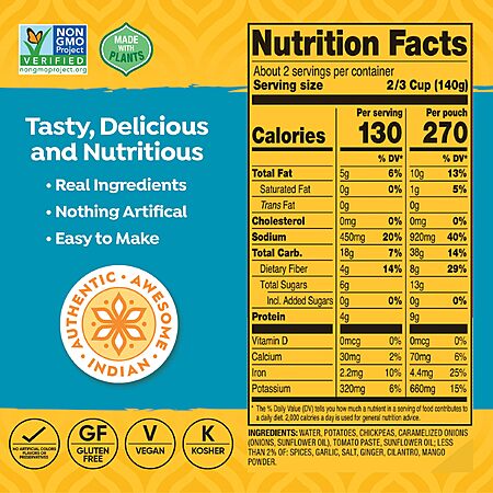 Ingredients: Water, Potatoes, Onions, Chickpeas, Tomato Paste, Sunflower Oil, Garlic, Salt, Ginger, Spices, Coriander, Cumin, Chili Pepper Powder, Cardamom, Turmeric, Mango Powder.