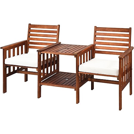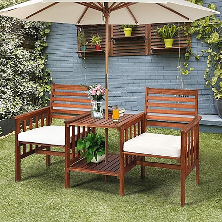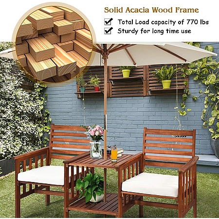 3pc Acacia Wood Loveseat Set w/Coffee Table, Thick Cushions, 2.1-inch Umbrella Hole $99.99 + Free Shipping