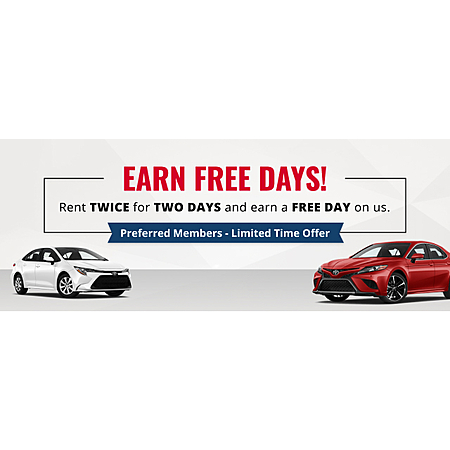 Avis Rent A Car will email you a free day coupon when you register first, rent twice for two days each, in an Intermediate car or larger. You may earn up to 5 days every month. Plus, if you are opted into Avis Preferred Points (free to join) program, you will also earn: