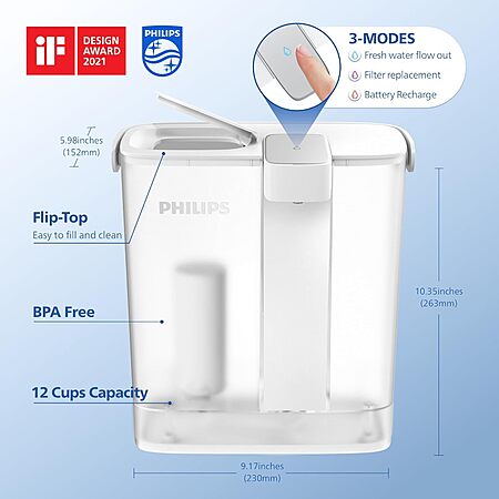 PHILIPS GoZero Next-gen Instant Water Filter Pitcher, Rechargeable Battery, Mirco-X Clean Technology, 3L 12 Cups, 1 Filter $30.99