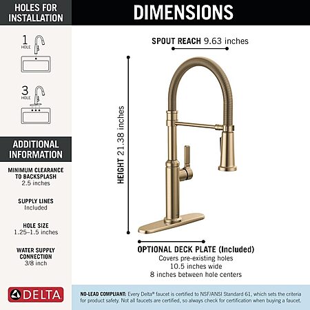 $255.00: Delta Rhett Pro Style Commercial Kitchen Faucet with Pull Down Sprayer, Single Hole Brushed Gold Kitchen Sink Faucet, Single Handle, Champagne Bronze 18829-CZ-DST