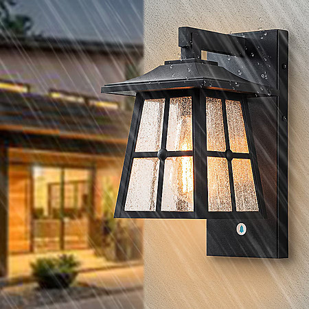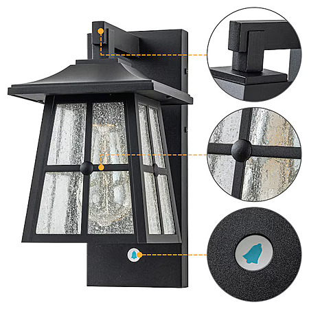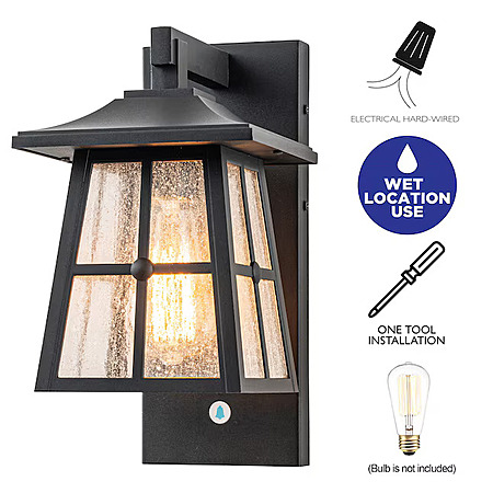 About this item- Matte black outdoor wall lantern with clear seeded glass shade.