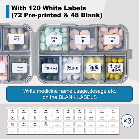 PRODUCT INCLUDES - You will get 3 pcs 14 compartment pill case boxes [Khaki+Grey+Pink] + 120 pcs small white labels. You can customize some informations such as medicine name, usage, dosage, etc. on the blank labels.