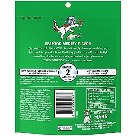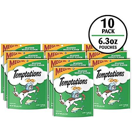 Amazon [amazon.com] has 10-Pack 6.3-Oz Temptations Classic Crunchy and Soft Cat Treats (Seafood Medley) for $23.27 - 5% when you check out via Subscribe & Save = $22.11.