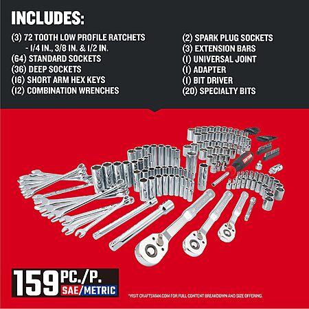 CRAFTSMAN Socket Set, 159 Piece Socket Wrench Set Mechanics Tools 1/4-in., 3/8-in., and 1/2-in(, 6 Point and 12 Point (CMMT12125) $84