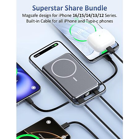 Magnetic Portable Charger, 10000mAh Power Bank, 5 in 1 Portable Charger with Built in Cable, 20W Fast Charging for Magsafe Battery Pack $24.99